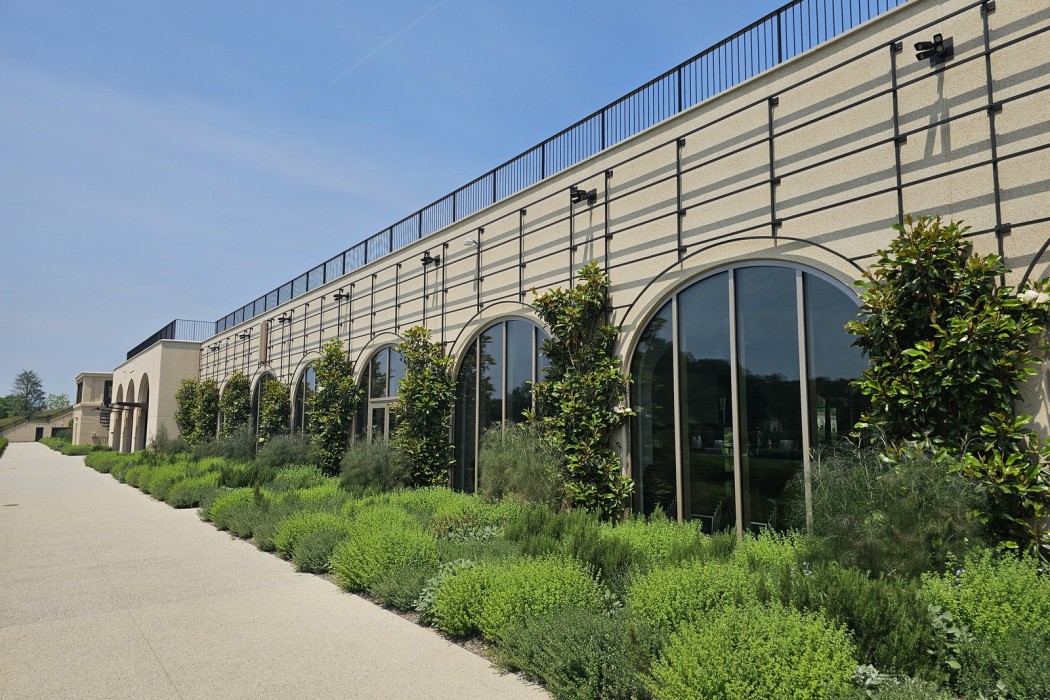 The West Conservatory is a new glass-enclosed building consisting of 32,000 square feet of underground basement and a 32,000 square foot elevated slab. The gardens, which are constructed above occupied space, appear to float on water, allowing the plants to thrive within a controlled environment. The water feature also includes movable planters.